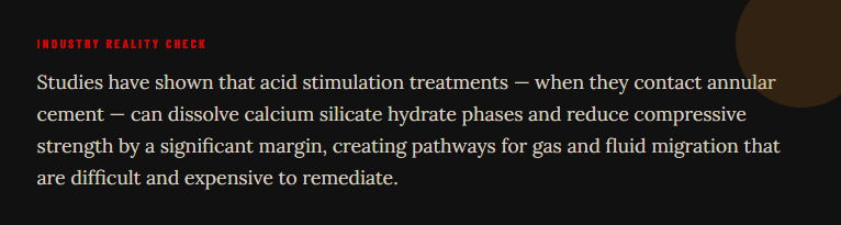 The problem is simple: when barrier materials degrade under acid exposure, well integrity fails. That means annular gas migration, uncontrolled fluid flow, failed plug and abandonment (P&A) seals, and costly remedial operations. In a regulatory climate that is tightening around well integrity and environmental compliance, a barrier system that can't withstand chemical attack is a liability.
