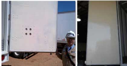 Chevron Phillips Shipping Trailers – coated some Sulfolene trailer doors w/ the ForSField G-75 (earlier brushable version). Sulfolene is a solid shipping in bags which slowly degrades, giving off sulfur dioxide which on contact w/ air moisture generated sulfuric acid. This is why the metal trailer doors usually degrade severely over 6 months and need to be replaced frequently. The picture shows the fresh coating as well as the de-glossed bust still completely intact coating after 8 months.
